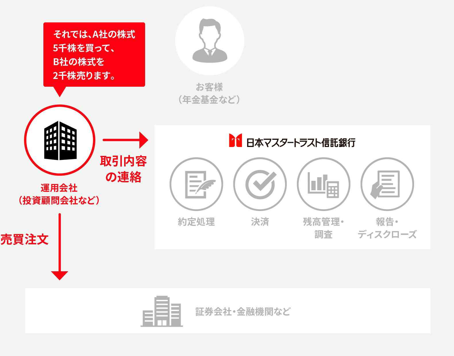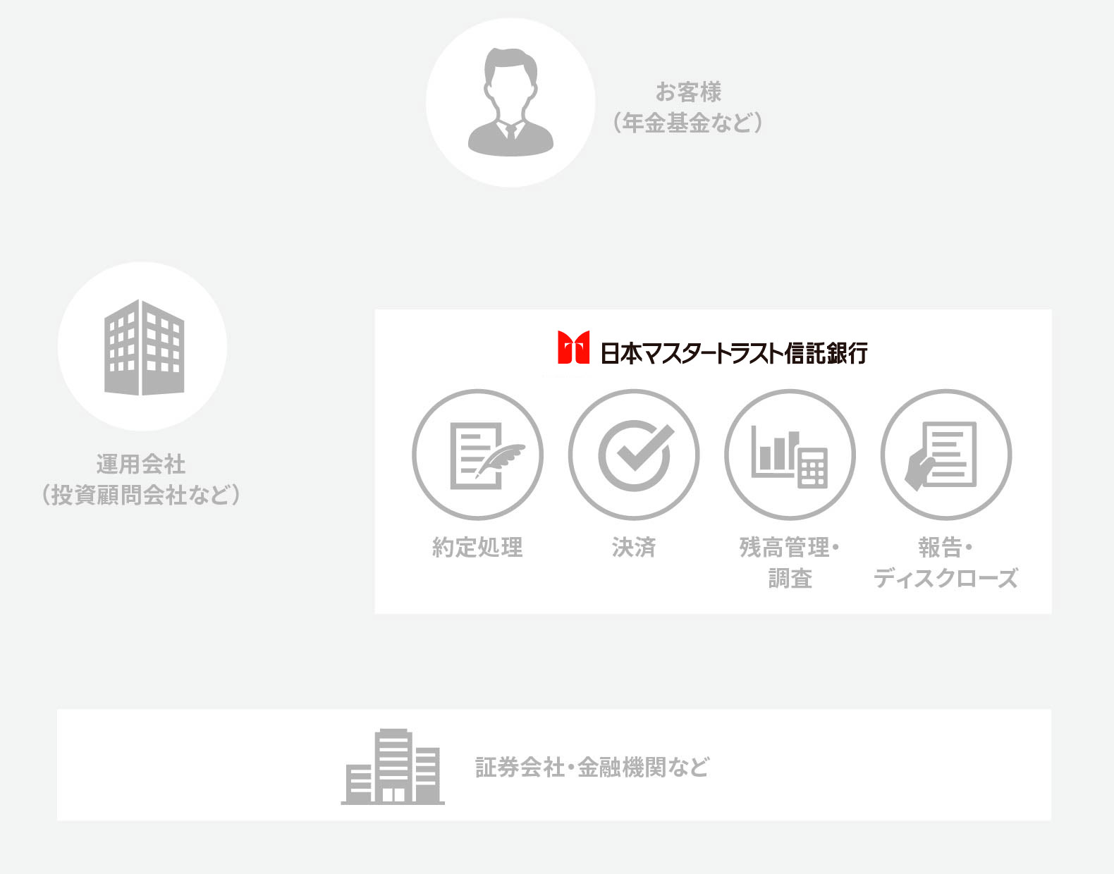 年金基金や投資信託などの資産は一般に、運用のプロ(運用会社)が世界各国の証券市場で株式や債券等に投資することで運用されています。これらの投資活動においては、有価証券等と資金の決済、有価証券等の保管、残高の管理、配当金・利金の受け入れといった資産管理業務が必要になります。当社はこれらの資産管理業務を「資産管理のプロ」として専門的かつ効率的に提供する「資産管理専門銀行」として、運用のプロや証券会社と緊密に連携。年金基金などのお客様の大切な資産を確実に守る役割を担っています。